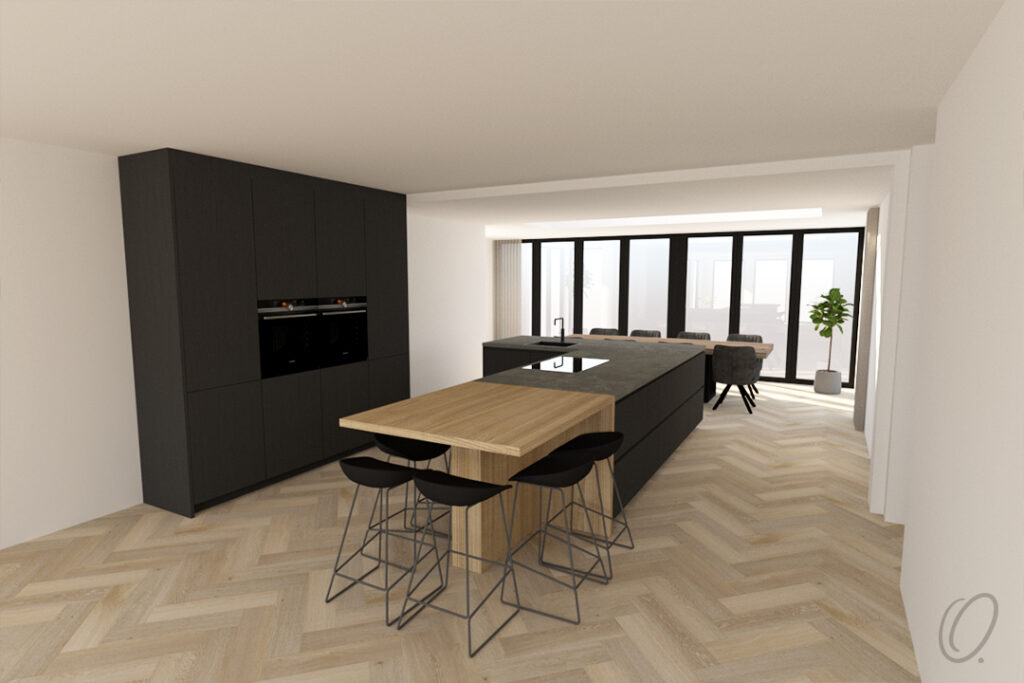 In de oude situatie bevond de keuken zich in een separate ruimte naast de eethoek. De wens van de klant is om de keuken in de serre te plaatsen, waardoor de originele keuken als bijkeuken kan dienen. Vanuit dit idee zijn meerdere voorstellen gepresenteerd met uiteindelijk een royaal L-vormig kookeiland als resultaat. Door de keuken te verplaatsen is een groot kookeiland mogelijk en is een echte leefkeuken ontstaan.