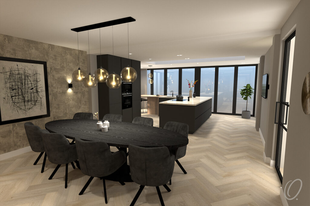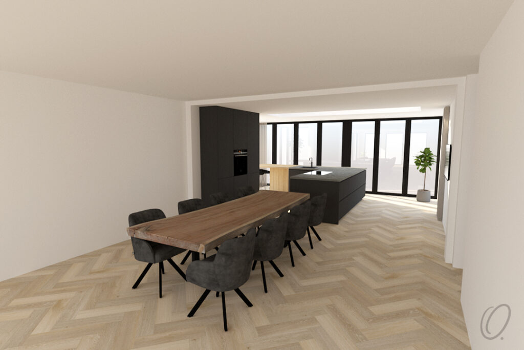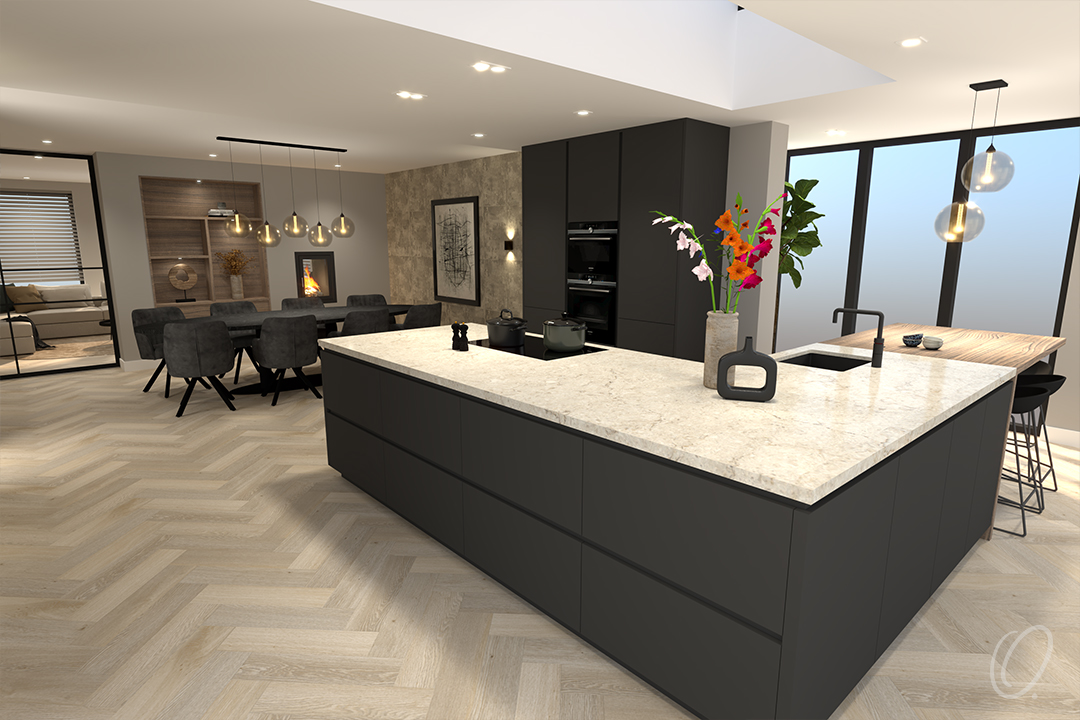 Op onderstaande impressies zijn twee verschillende keukenopstellingen gevisualiseerd. Hiermee kun je vooraf heel goed inschatten wat de invloed is van de ontwerpkeuzes in de praktijk. Er is een variatie met de keuken in de serre en een variatie met de keuken in het midden van de woning ingetekend. Om het effect te kunnen beoordelen werkt een 3D ontwerp als een waardevolle tool voor de juiste besluitvorming.