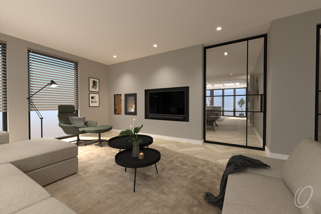 De wens om de houthaard te blijven behouden heeft zich vertaald in een chique en functionele oplossing. Ook zijn diverse indelingsvariaties voor de zithoek ingetekend. Omdat een goede zit voor de televisie  en de juiste kijkafstand belangrijk, is voor een multifunctionele roomdivider gekozen. De grote stalen schuifdeur kan in zijn geheel in de roomdivider schuiven, waardoor het naar keuze een open of afgesloten ruimte is. De televisie is verzonken in de roomdivider, zodat het een royalere indruk maakt. Vanaf de bank heb je een mooie doorkijk naar de keuken, waardoor het niet opgesloten voelt. De tunnelhaard geeft sfeer aan zowel de woonkamer als de keuken. Aan de keukenzijde is de roomdivider tevens voorzien van een inbouwkast voor decoratie en om wat losse spullen in op te bergen. Naast het interieurontwerp is ook het verlichtingsplan geheel aangepakt. Door het nieuwe te plaatsen plafond is de indeling en positie van de verlichting vrij te kiezen. Hier is gekozen voor afwisselende toepassing van plafondspots, staande lampen en wandlampen. Boven het kookeiland is in verband met de lichtstraat gekozen voor een aantal duo-spots die als goed werklicht fungeren tijdens het koken. Ten behoeve van gelaagdheid en sfeer bij de bar gekozen voor een hanglamp.