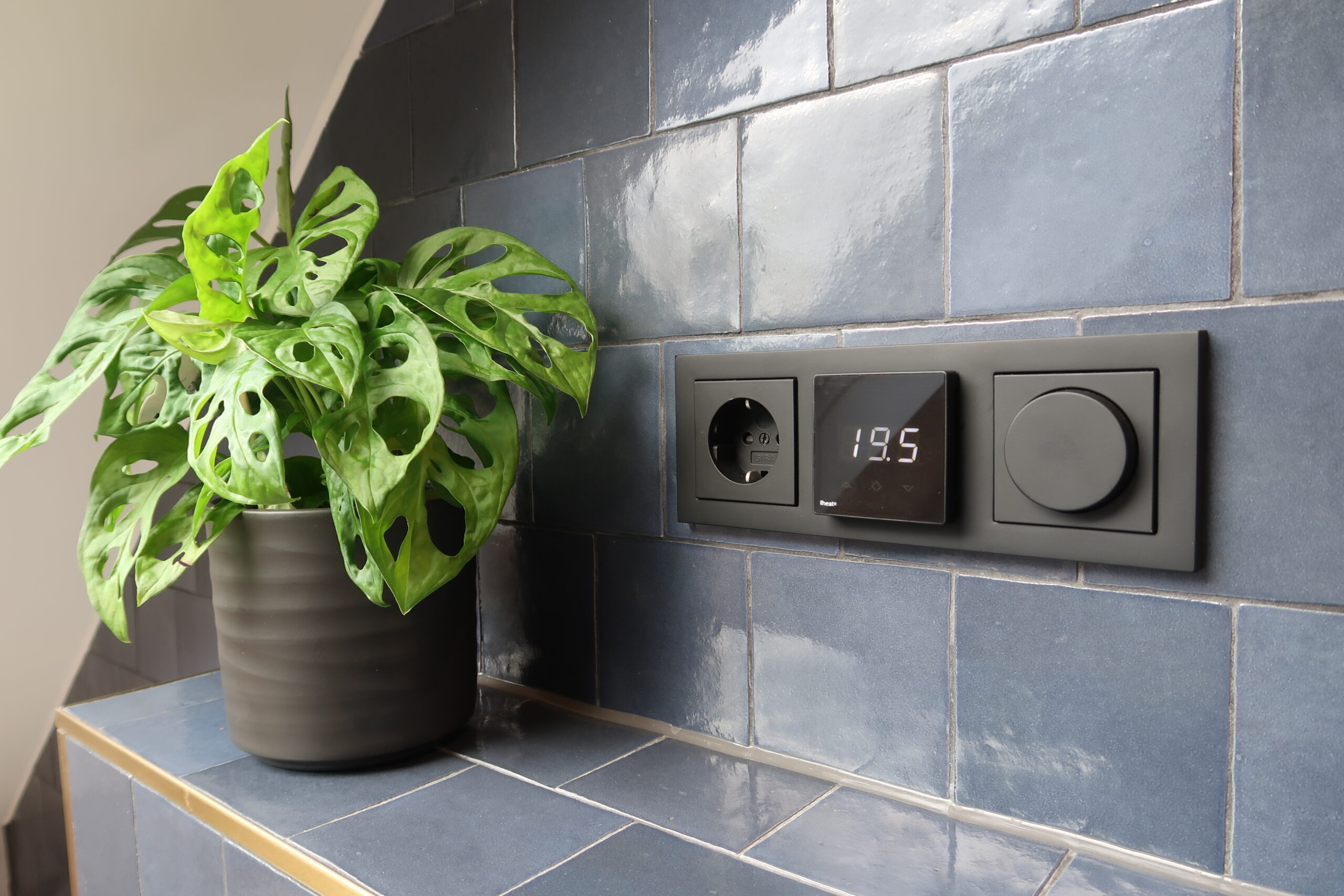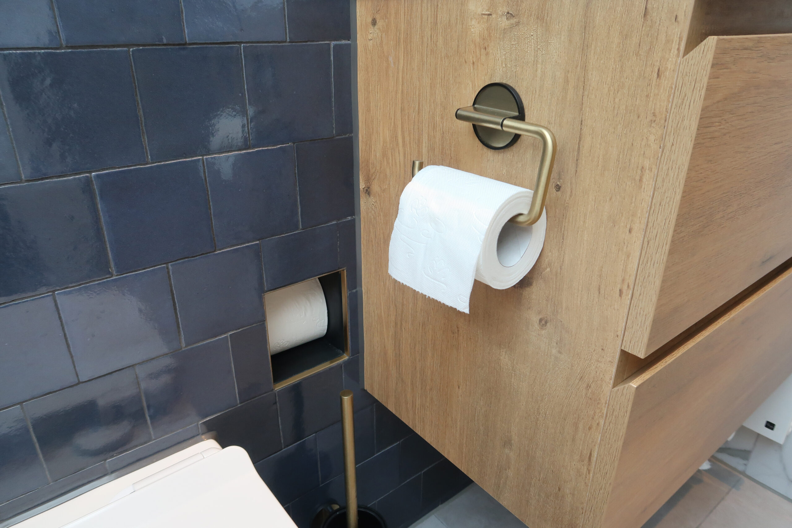 De voorzetwand van het toilet en de wasbak sluit naadloos aan op de badombouw en is uitgevoerd met een gouden tegelstrip. Om meer ruimte te besparen is het wasmeubel gedeeltelijk in de voorzetwand gebouwd en is er een eigen ontworpen ingebouwde WC-rol houder geplaatst, precies tussen het toilet en het wasmeubel in. Het bedieningspaneel van de elektrische vloerverwarming is met een kleine aanpassing in het zwarte elektraframe passend gemaakt, zodat alle functies netjes gegroepeerd zijn. Voor het bad is een gelijke wandkraan gekozen als voor de wasbak voor meer rust in het ontwerp. De douche is voor dit formaat badkamer zeer ruim en heeft een plateau voor douchespullen en een mooie, slanke design douchedrain. Het uiteindelijke resultaat geeft ondanks het compacte formaat een ruimtelijke beleving.
