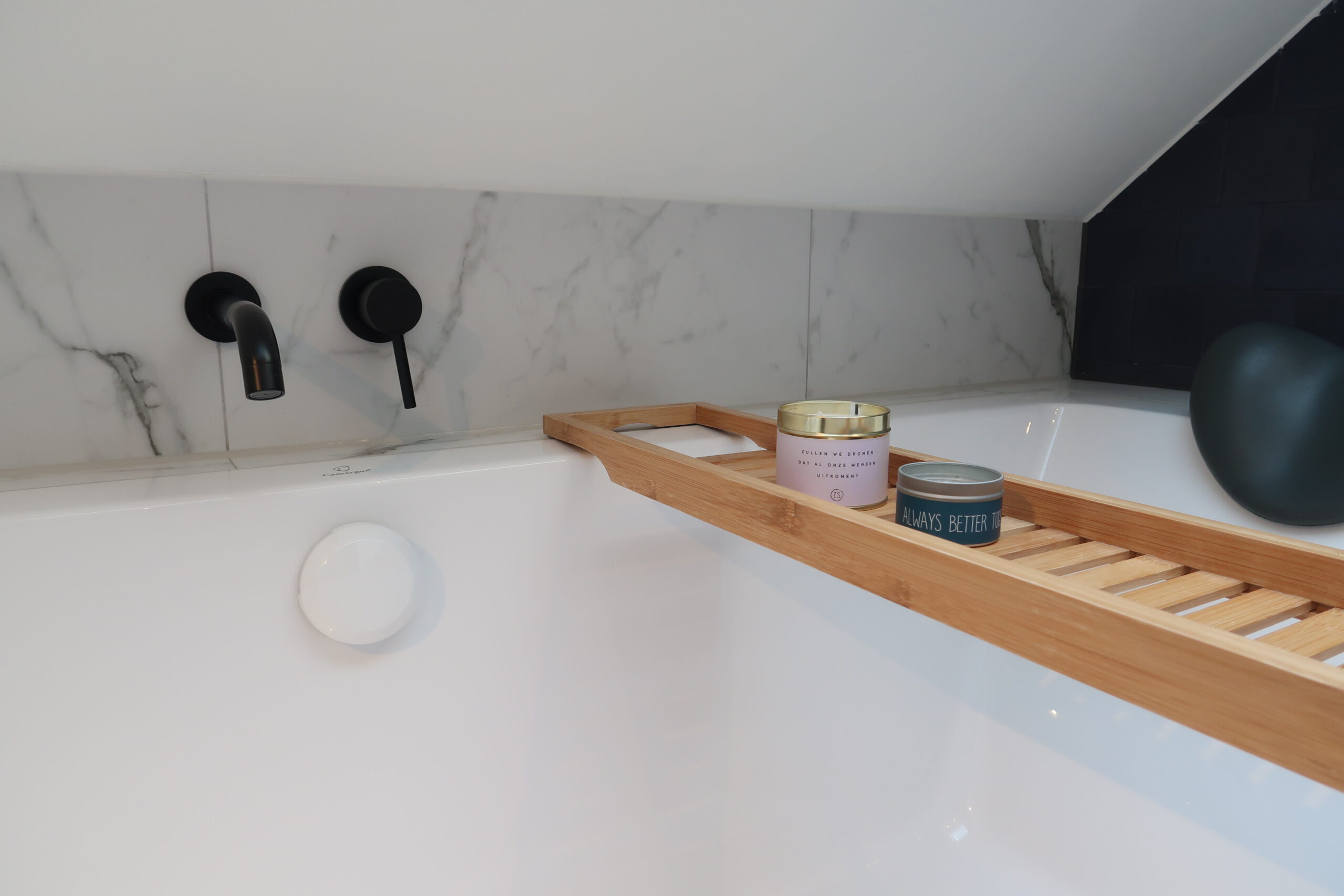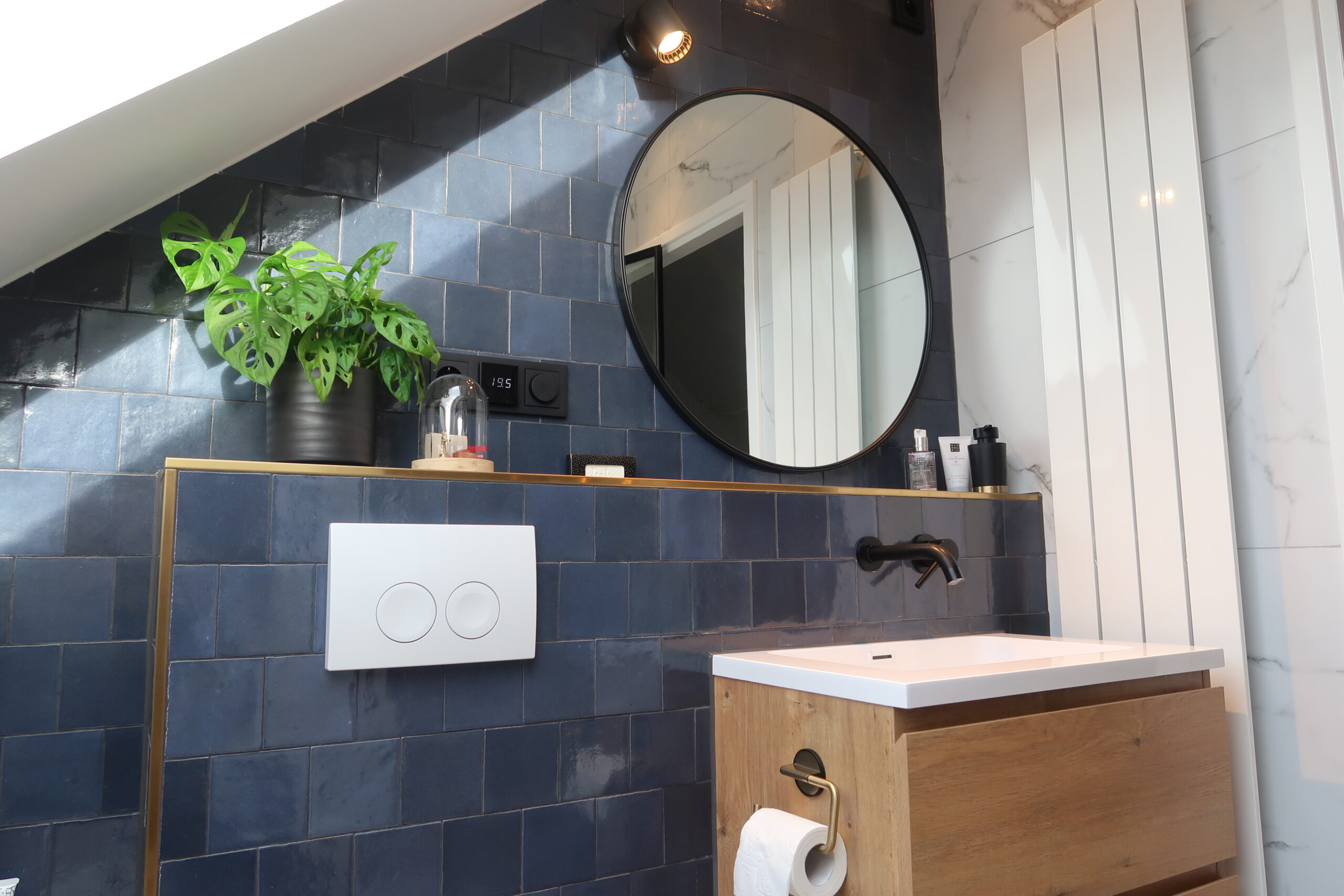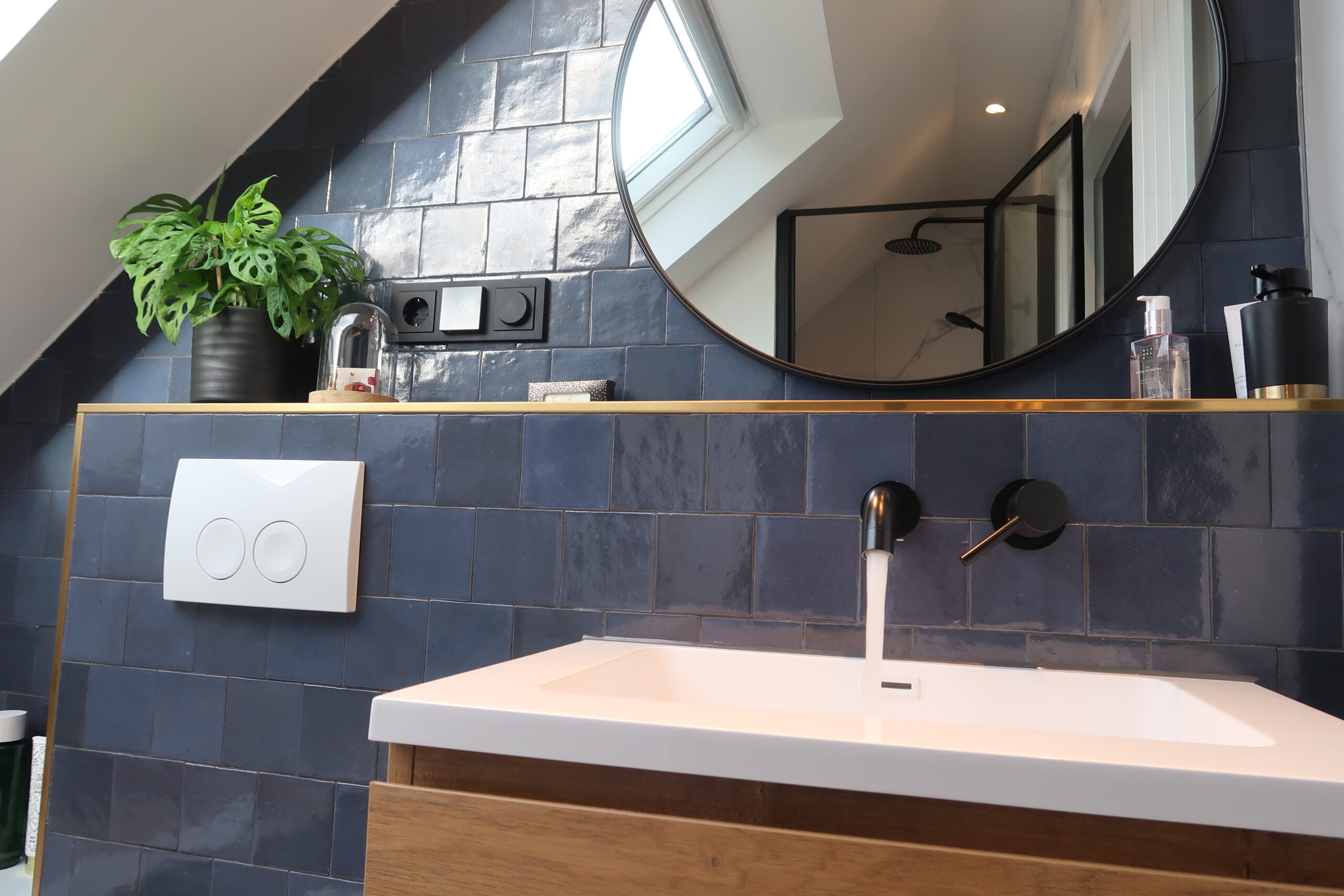 Na het plaatsen van het dakraam werd echt duidelijk hoeveel ruimer de badkamer leek, hierdoor werd het mogelijk het toilet naast het wasmeubel te plaatsen vanwege de toegenomen hoofdruimte. Het leidingwerk en de poten van het bad zijn zo diep mogelijk in de vloer gefreesd, waardoor er ondanks het schuine dak een behoorlijk diep bad mogelijk bleek. Het bad is optisch in de ombouw verzonken waardoor je net iets meer schouderruimte rondom het bad hebt en het tegelwerk strakker uitgevoerd kon worden. Door alle leidingen in te fresen is de gehele vloer slechts vier centimer hoger geworden, door het schuine dak telt hier namelijk elke centimeter. De dimbare LED spots in het plafond en bij het bad zijn aan elkaar gekoppeld, terwijl de LED spot bij aan de blauwe tegelwand afzonderlijk te bedienen is voor beter zicht bij de spiegel.