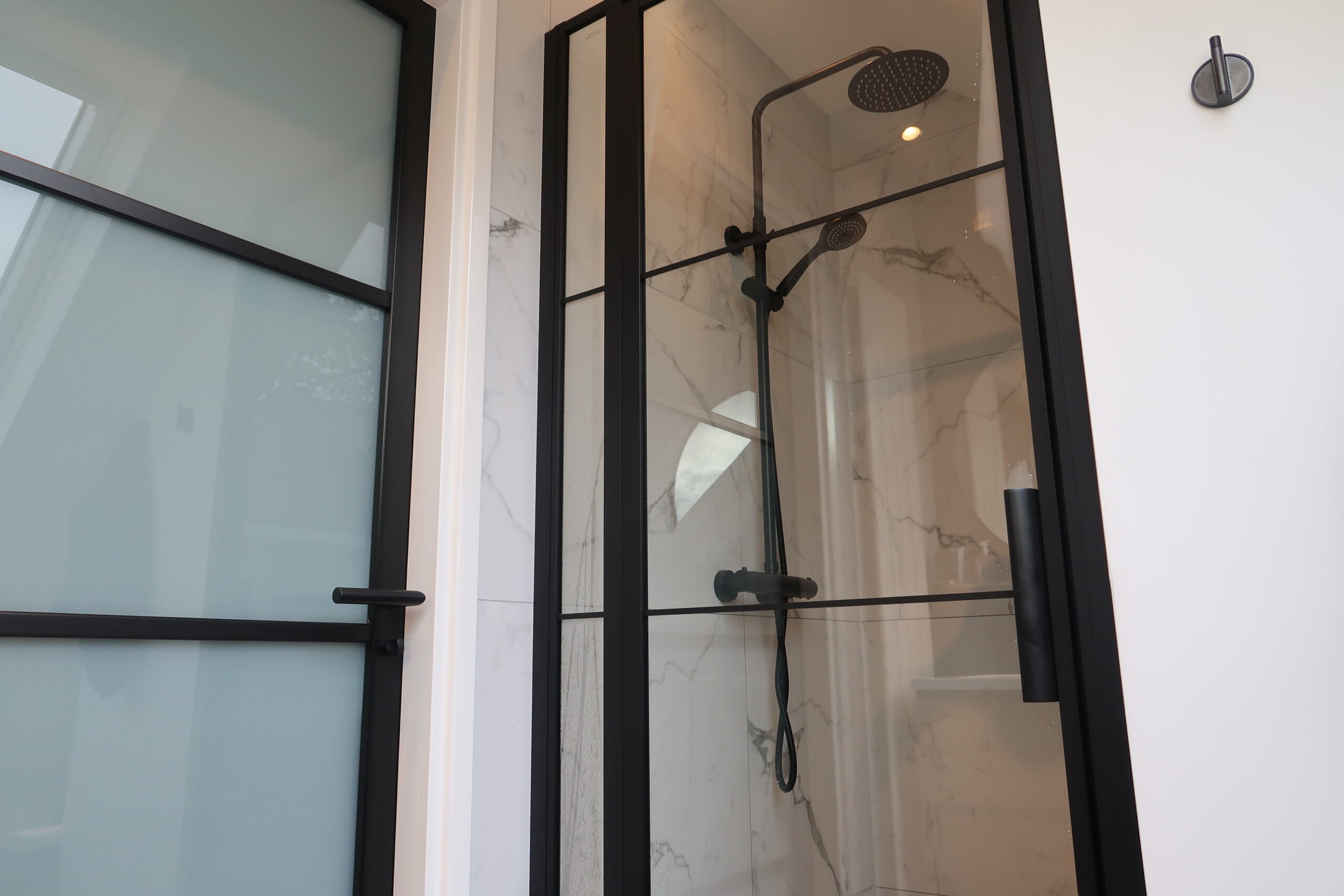 Hoewel de ruimte in eerste instantie te klein leek, is toch een zeer fraaie tweede badkamer ontstaan voorzien van een royale doucheruimte