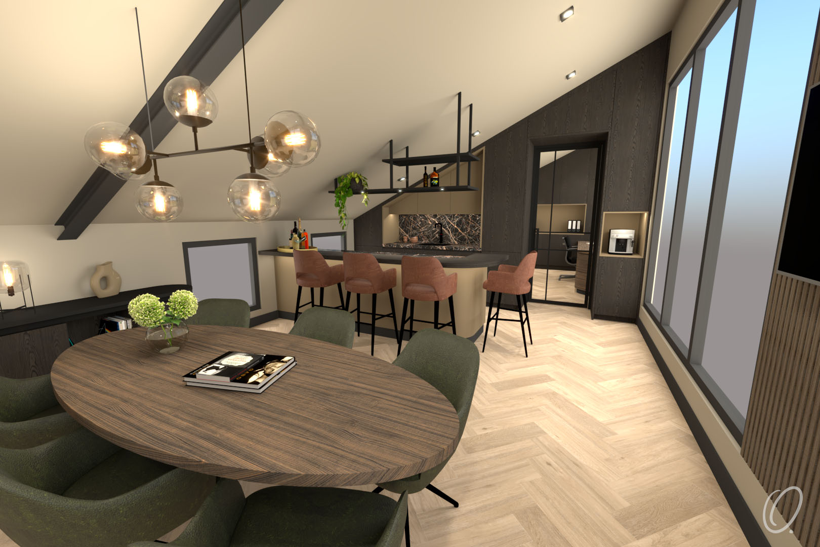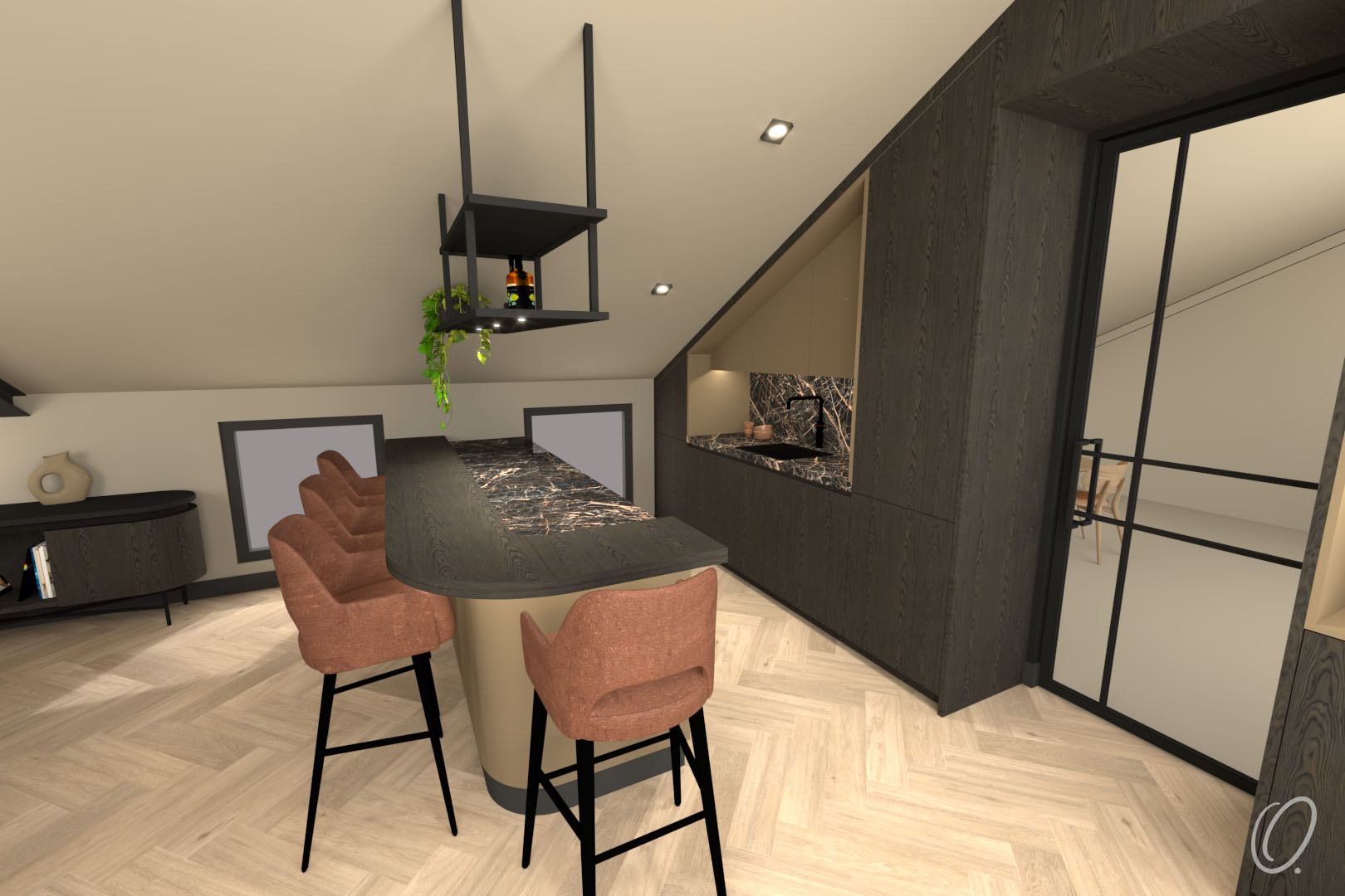 Op basis van een aantal eisen en wensen is een ontwerp uitgewerkt: er moest een keuken met bar in de kantine komen én een plek om te vergaderen en ontwerpen te tonen. In de keuken is gekozen voor een eiland met ronde hoek en een op maat gemaakte kastenwand over die over de taatsdeur getekend is. De nissen zijn uitgevoerd in een contrasterende kleur, gelijk aan de voorzijde van de bar. De bar bestaat uit een verhoogd gedeelte waar krukken aan geplaatst kunnen worden. Boven de bar hangt een frame met twee planken voor decoratie en fijn werklicht boven het werkblad. De nissen zijn uitgevoerd met een ledstrip en in het plafond zijn diverse spots verwerkt voor een aangenaam oriëntatielicht. Aan de bar staan een viertal krukken in cognac of roestbruin leder. Het plafond is in dezelfde kleur meegeschilderd als de wanden voor een rustig en geborgen effect.