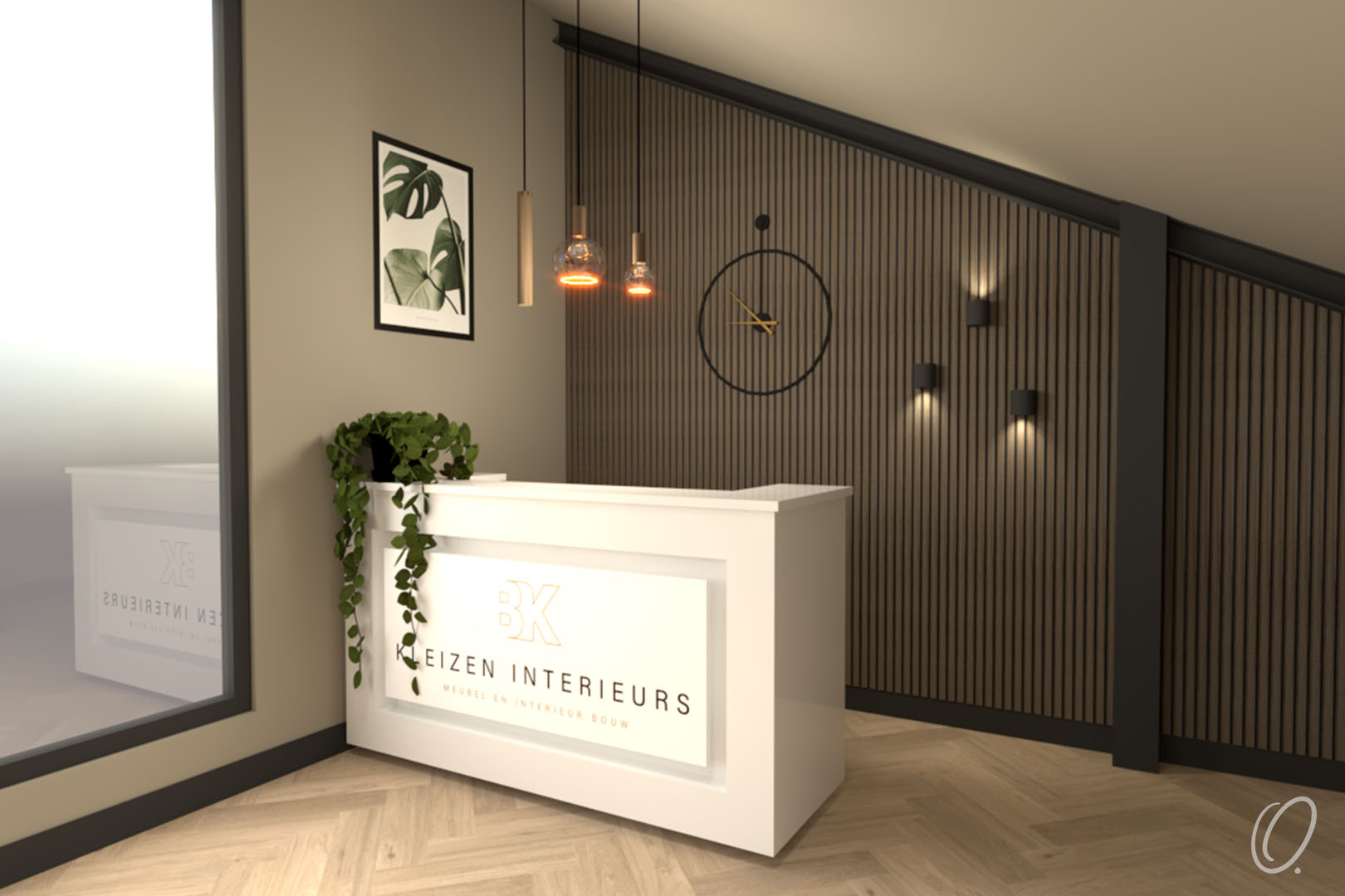 Tegen de achterwand is een wandvullende kast óm de aanwezige afvoerbuizen getekend. De printers staan in een uitgelichte nis, rondom deze nis zijn veel kasten te vinden. Onder de printer is een verwarming mogelijk, door deze met latten af te werken valt deze mooi weg. Rechts en links van dit lattenpaneel zijn laden getekend met een uitsparing in verband met de aanwezige afvoerbuizen aan de wand. Helemaal linksonder het bureau is nog een deurtje om bij de ruimte achter het bureau te kunnen. Er zijn spots toegevoegd in het plafond in een U-vorm, bij het bureau is nog een extra bureaulamp geplaatst voor praktisch werklicht. Zo is de gehele ruimte mooi gelijkmatig uit te lichten én kun je de accenten op de juiste details leggen.