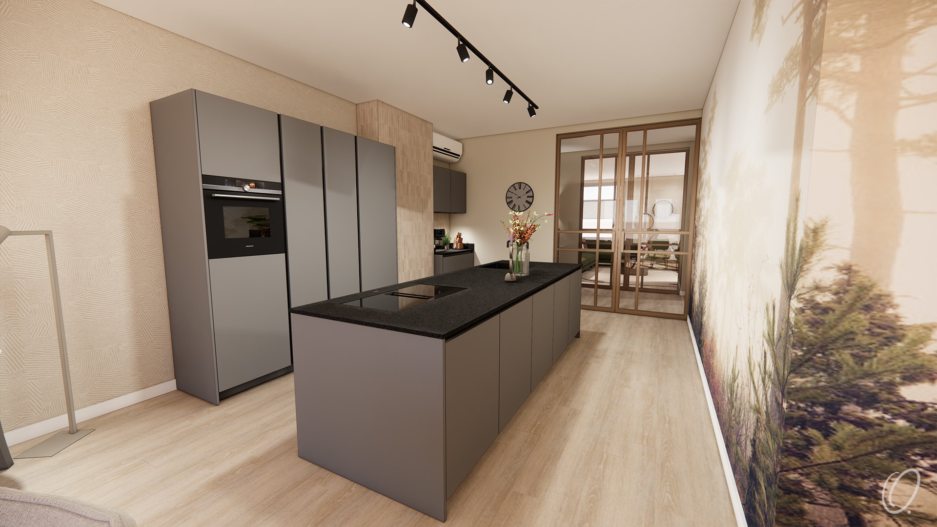 Opvallend detail in de keuken is het fraaie fotobehang van een mistig bos, door deze om de hoek te zetten creëer je optisch een groots effect. Omdat deze zone de smalste ruimte in de keuken is, zorg je met dit fotobehang ervoor dat je meer de diepte in kijkt en het ruimer aanvoelt. De eethoek is voorzien van een eettafel in walnoot in een deens ovale vorm, waardoor je eenvoudig om de eettafel kunt lopen. Het televisiemeubel is rustig gehouden, vanwege de ramen in de muur en de reeds aanwezige plafondspots bevat het meubel geen kader tot aan het plafond. Om wel het royale effect te bereiken is gekozen voor verticale akupanelen achter de televisie die de hoogte benadrukken. Het meubel is van hetzelfde materiaal als de maatwerkkast in de keuken en bevat zes laden/valdeuren waarin voldoende opgeborgen kan worden. Door het lange meubel kun je de decoratie die normaal gesproken in de vensterbank staat op het meubel plaatsen. Hierdoor kun je grotere gebaren maken, wat zorgt voor meer rust. In de aankleding is gekozen om de groene en roest-oranje tinten terug te laten komen. De salontafel heeft een mooie bruine kleur die past bij de eettafel. Het natuurlijke thema komt hier terug in de prints, kleuren en afbeeldingen.