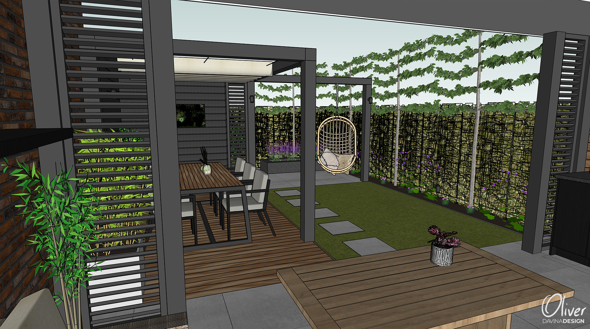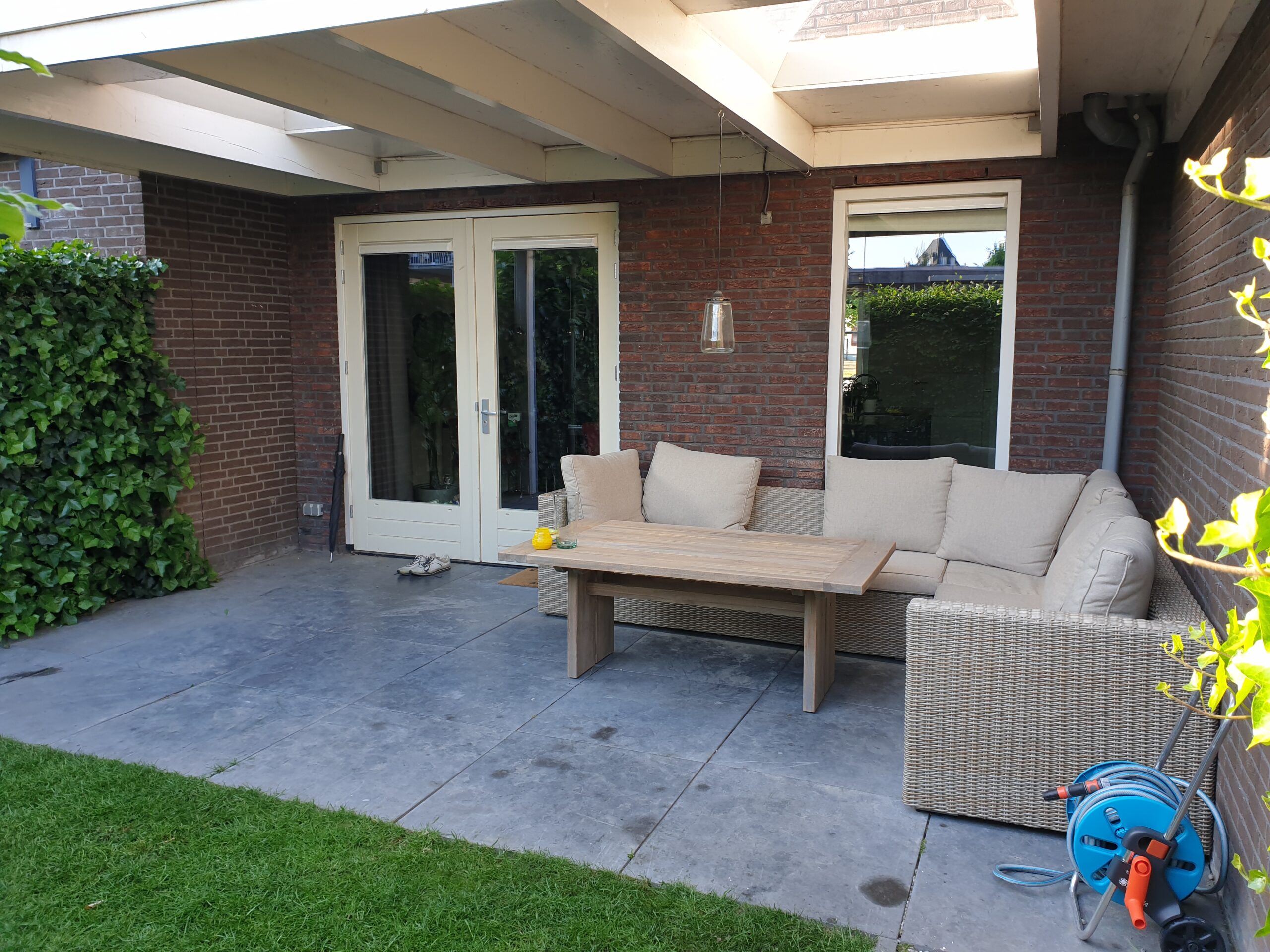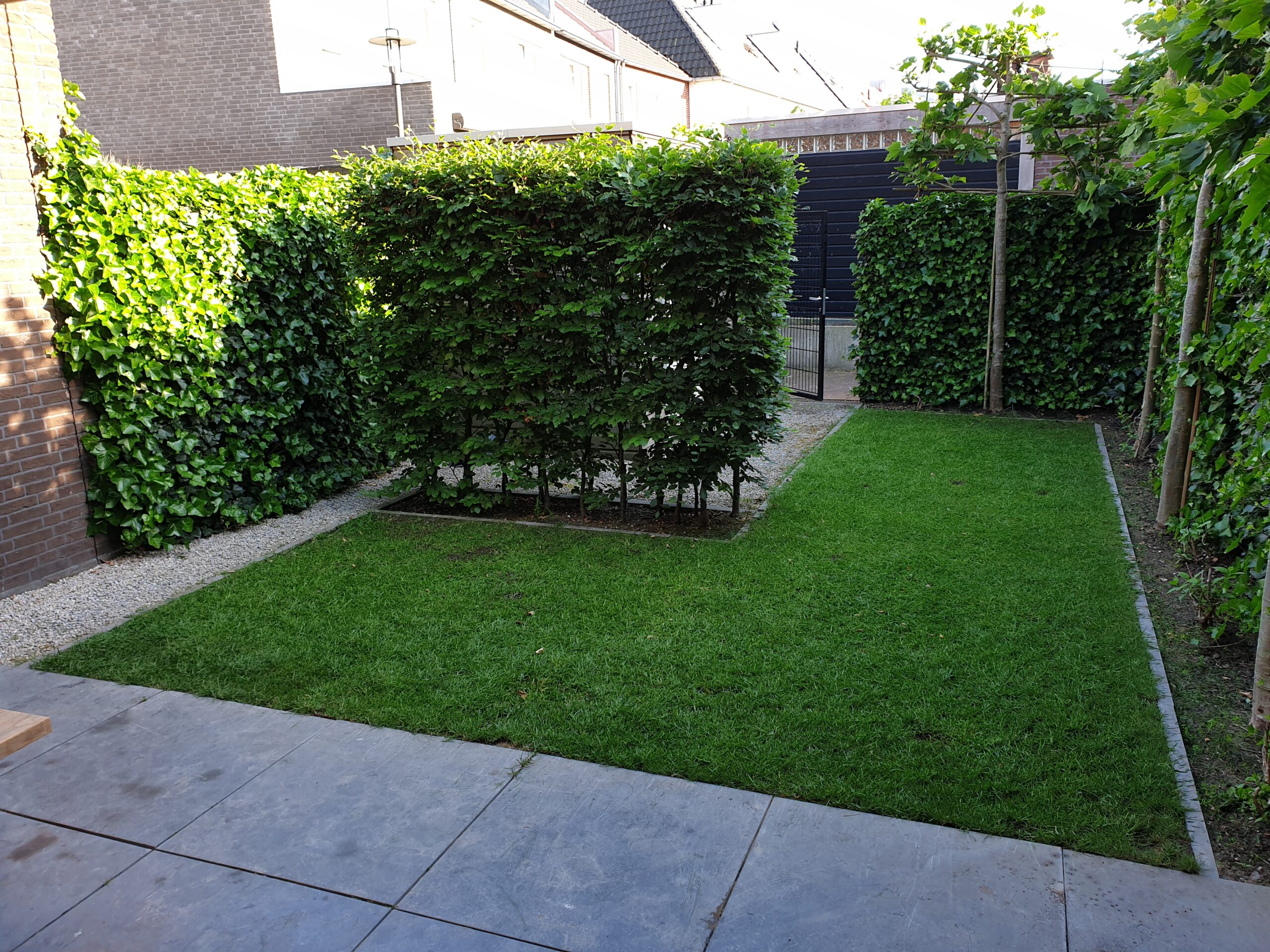Door de huidige overkapping verder aan te kleden met tuinshutters ontstaat een soort geborgenheid en gevoel van privacy in de tuin. De eethoek is links in de tuin gesitueerd, omdat hier nog heerlijk van de middagzon kan worden genoten, en helemaal achterin het minder prettig verblijven is. Het achterste gedeelte van de tuin is bestraat en voorzien van een mooie plantenbak, een grote wens was om de leibomen te laten staan. Door staptegels in het gras te plaatsen lijkt de tuin optisch breder en vormt het de verbinding tussen het voor- en achterterras. Het vlonderterras zorgt voor de nodige sfeer en vormt een mooi contrast met de zwart gebeitste schuttingdelen, pergola en berging.