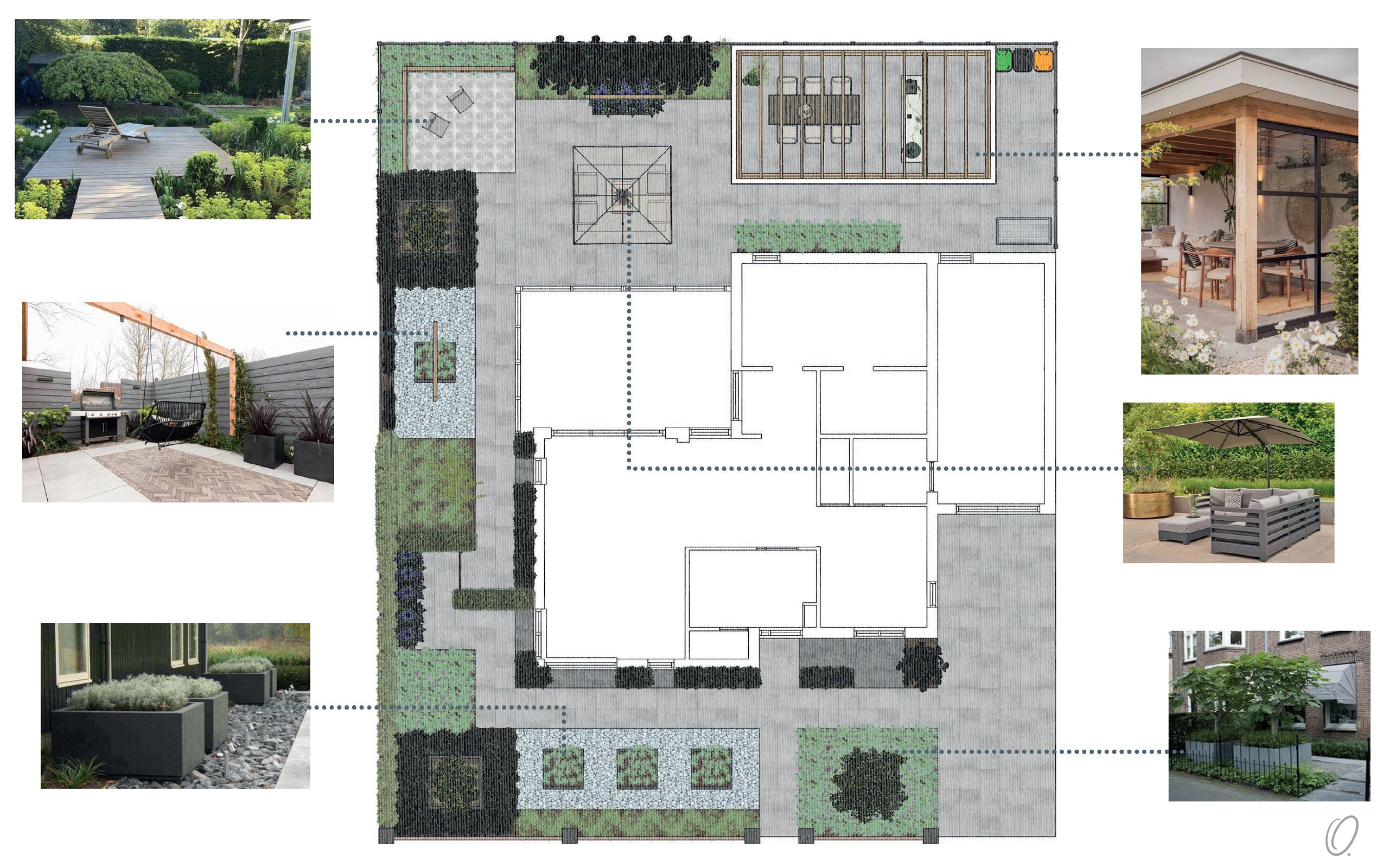 Na het interieurontwerp van de gehele benedenverdieping en het ontwerp van de inmiddels gerealiseerde serre is voor deze woning ook een complete tuin uitgetekend. De gehele tuin werd herontworpen en opnieuw ingedeeld met als voorwaarde een mooie afwisseling van planten en struiken, maar geen gras. Om toch een groen gevoel te verkrijgen zijn diverse plantenbakken en bloemborders in het plan verwerkt. Bovenstaande plattegrond is uiteindelijk het uitgangspunt geworden voor het ontwerp, aangevuld met de getoonde inspiratiebeelden geeft het een goed beeld van de gewenste sfeer.